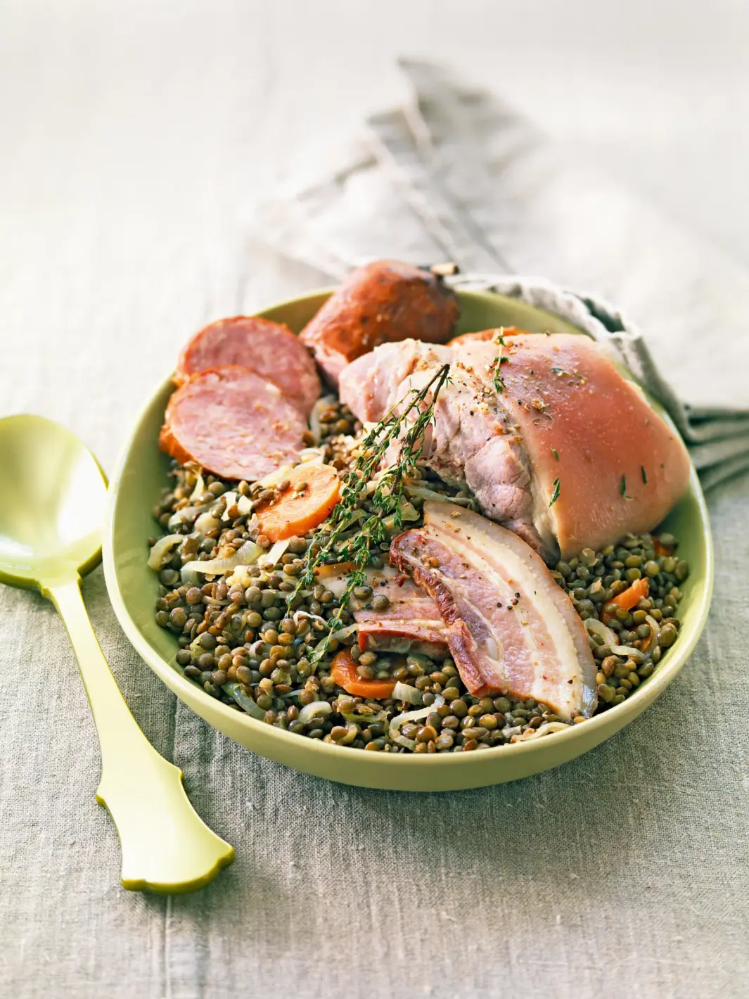Това ястие с зелена леща е незаменима част от зимната трапеза на швейцарците и французите. Този специален сорт леща идва от региона Пюи-ан-Веле и е отличен източник на желязо и магнезий.
