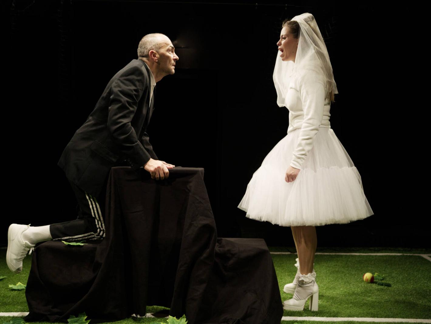 Много скоро всички заехме местата си в малкото пространство, което нямаше как да не предизвика усещане за близост и веднага грабваше вниманието. Това се оказа ключово за постановката. Героите бяха буквално на една ръка разстояние от нас, играеха тенис, плачеха и се смееха само на сантиметри от публиката, която внимателно наблюдава всяко тяхно движение. Според мен това беше едно много смело сценографско решение на режисьора Стилиян Петров и на неговия екип, което зададе един определен ритъм още от самото начало и вдъхна нов живот на добре познатата творба на Чехов.