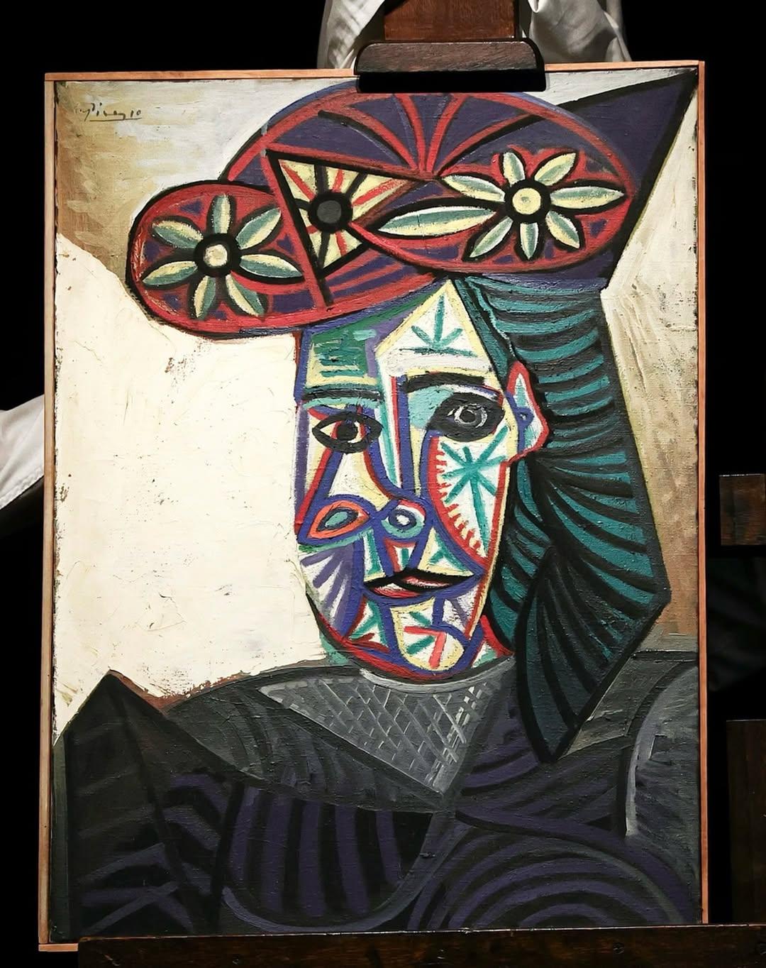 Картината „Бюст на жена с шапка с цветя (Дора Маар)“ е нарисувана през юли 1943 г.