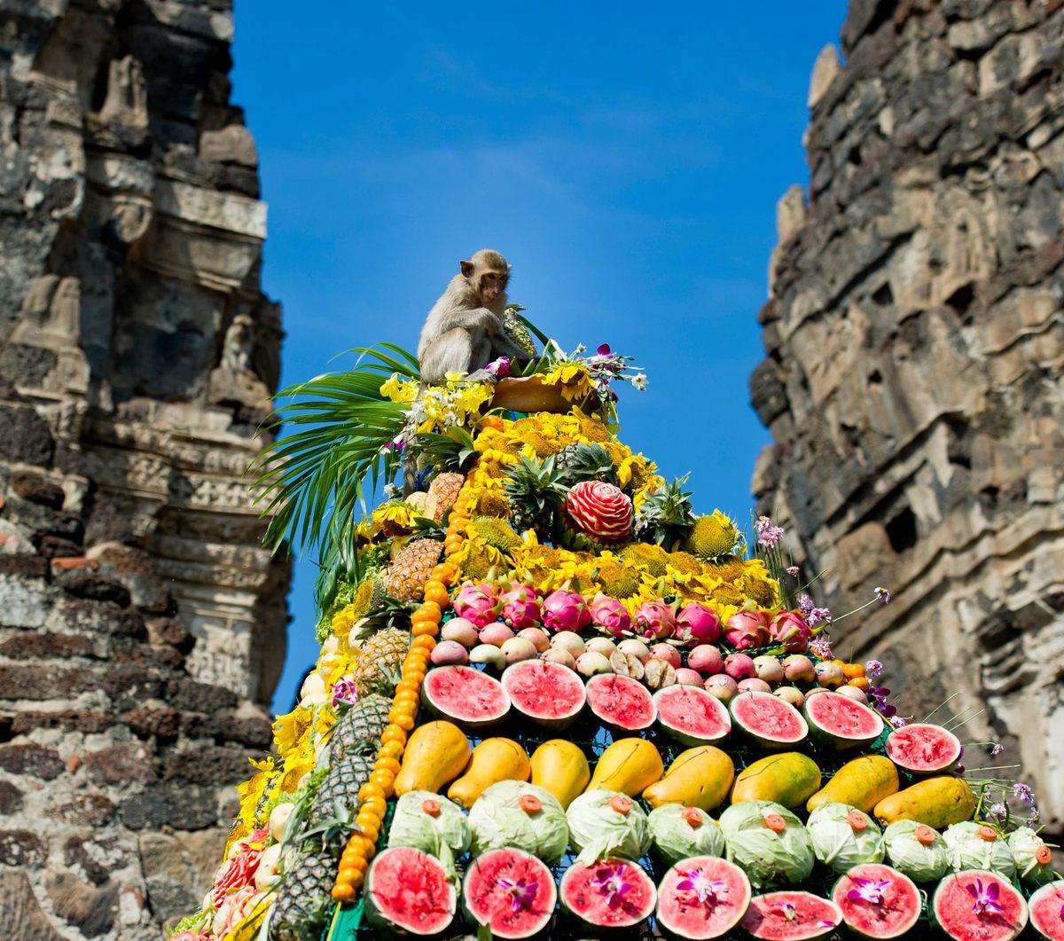 Всяка година през ноември тайландското градче Лопбури се превръща в сцена на един от най-необичайните банкети в света, като отдава почит на своята многобройна популация от макаци с цветно пиршество. Тъй като местните жители почитат тези животни като потомци на митична маймуна-воин и носители на късмет, те се радват на пълна свобода. В рамките на празника над 2000 килограма пресни плодове, зеленчуци и лакомства се подреждат с майсторство, образувайки впечатляващи ядливи скулптури, които превръщат градчето в грандиозна трапеза за хилядите „космати гости“. Традиционно празничната трапеза се разполага в храма „Пхра Пранг Сам Йод“, където част от храната се сервира вградена в ледени блокове, за да запази своята свежест въпреки голямата жега в страната по това време.