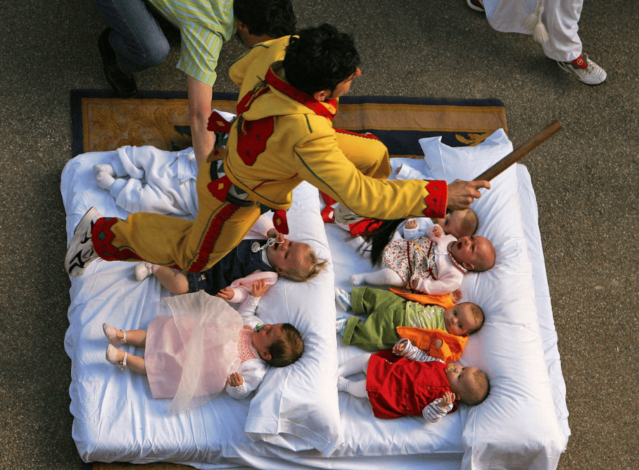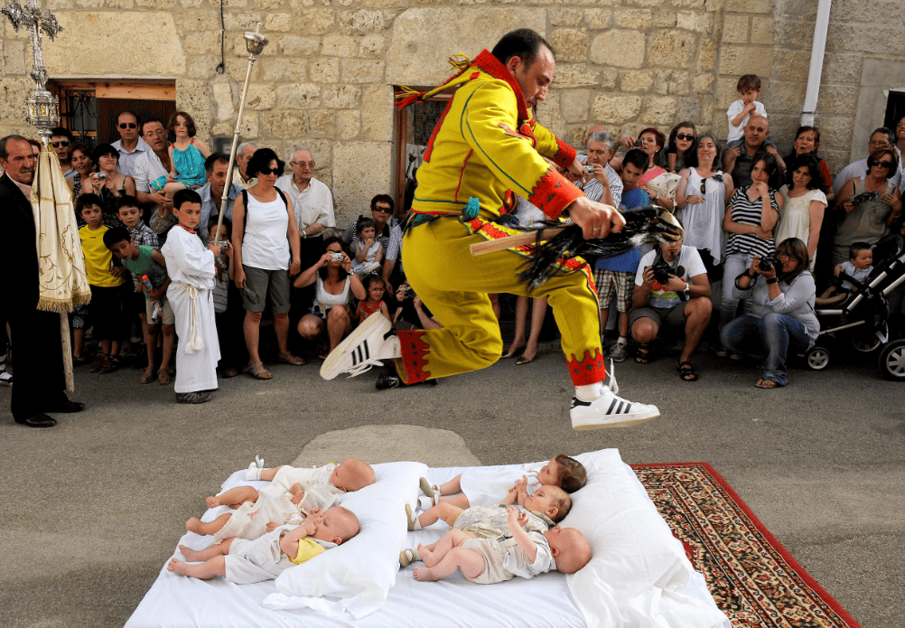 „Ел Колачо“, известен като „скачане над бебета“, е традиционен испански обичай от 1620 г., който се провежда ежегодно в село Кастрильо де Мурсия, провинция Бургос. В рамките на ритуала мъже, маскирани като дяволи в червено-жълти костюми, прескачат бебета, родени през последната година, които лежат върху матраци на улицата. Събитието е съпроводено от закачки с публиката до появата на барабанистите, наречени „атабалеро“, които дават сигнал за началото на ритуала. Смята се, че прескачането символизира прогонване на злите сили и носи защита от болести и нещастия, като според местните вярвания дори пречиства децата от първородния грях и им осигурява закрила през живота, макар тази интерпретация да не се приема от Католическата църква, която подчертава, че духовното очистване се извършва единствено чрез светото кръщение. След ритуала бебетата се поръсват с розови листенца и се връщат на родителите си. През последните години фестивалът привлича посетители от цял свят, въпреки че първоначално е бил местна традиция. И до днес произходът му остава неясен, но според някои историци се предполага, че е възникнал като ритуал за плодородие.
