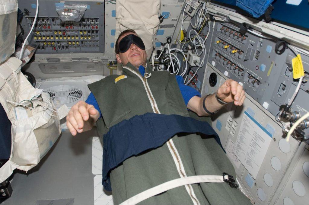 Астронавтите не могат да лежат на легло заради липсата на гравитация и затова те спят в прикрепени към стената спални чували. Средно те спят по 6 часа на ден, като сънят им често бива прекъсван от ограниченото пространство и липсата на ясни времеви граници за това кога е нощ и кога е ден. На Международната космическа станция има до 16 изгрева и залеза на ден, което естествено обърква биологичния ритъм на човешкия организъм. Затова астронавтите следват строго определен график и използват маски за очи и контролирано осветление, за да подпомогнат съня си.