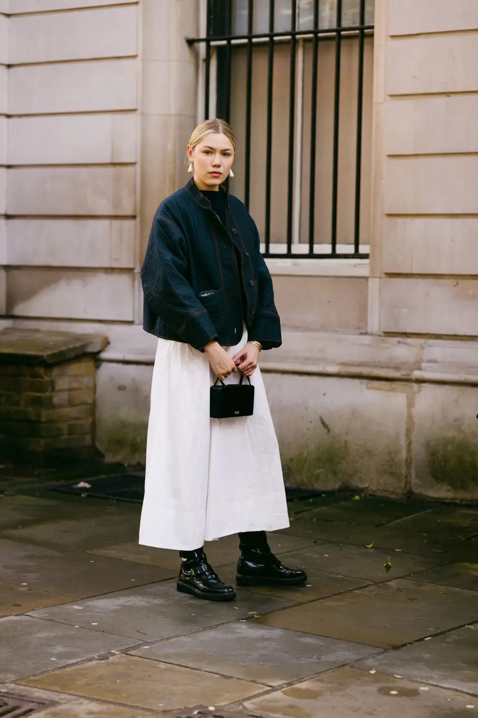 Въпреки че тази визия олицетворява минимализма, тя привлича погледите със смелата си структура и силует. В комбинация с бляскави токчета и цветна малка чанта, която никога не губи стойността си и служи като акцент, тази на пръв поглед проста комбинация се превръща в завършен и хармоничен новогодишен тоалет. Изберете памучна пола в светъл цвят, за да добавите свежест и ефект, който привлича вниманието – напомнящ за летните ви дни край морето през 2025 г.