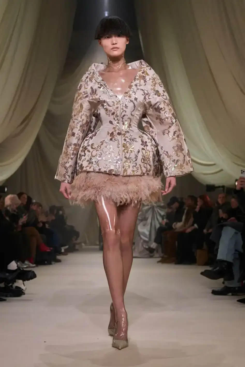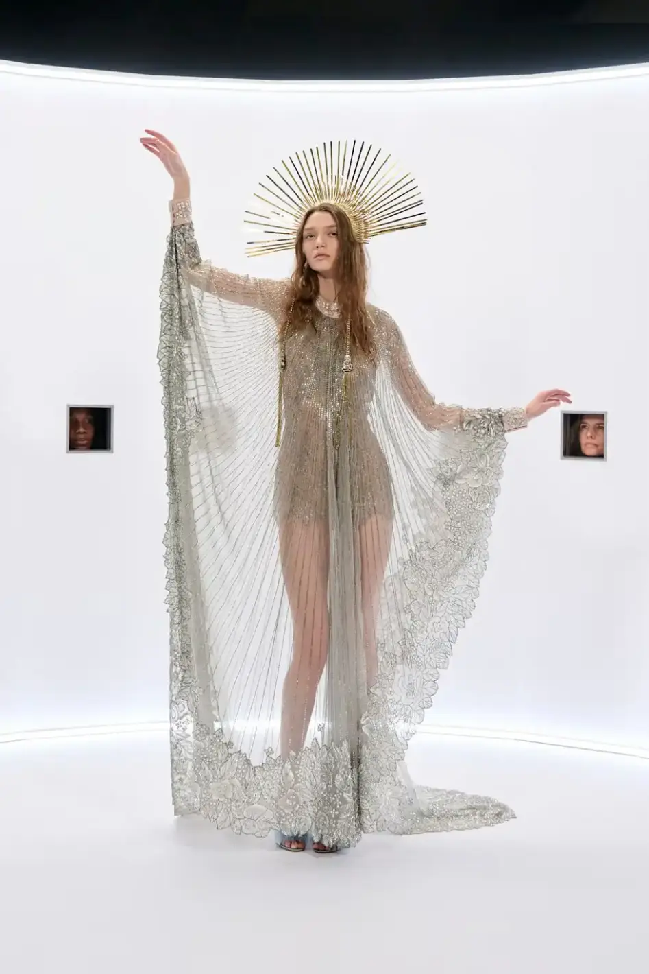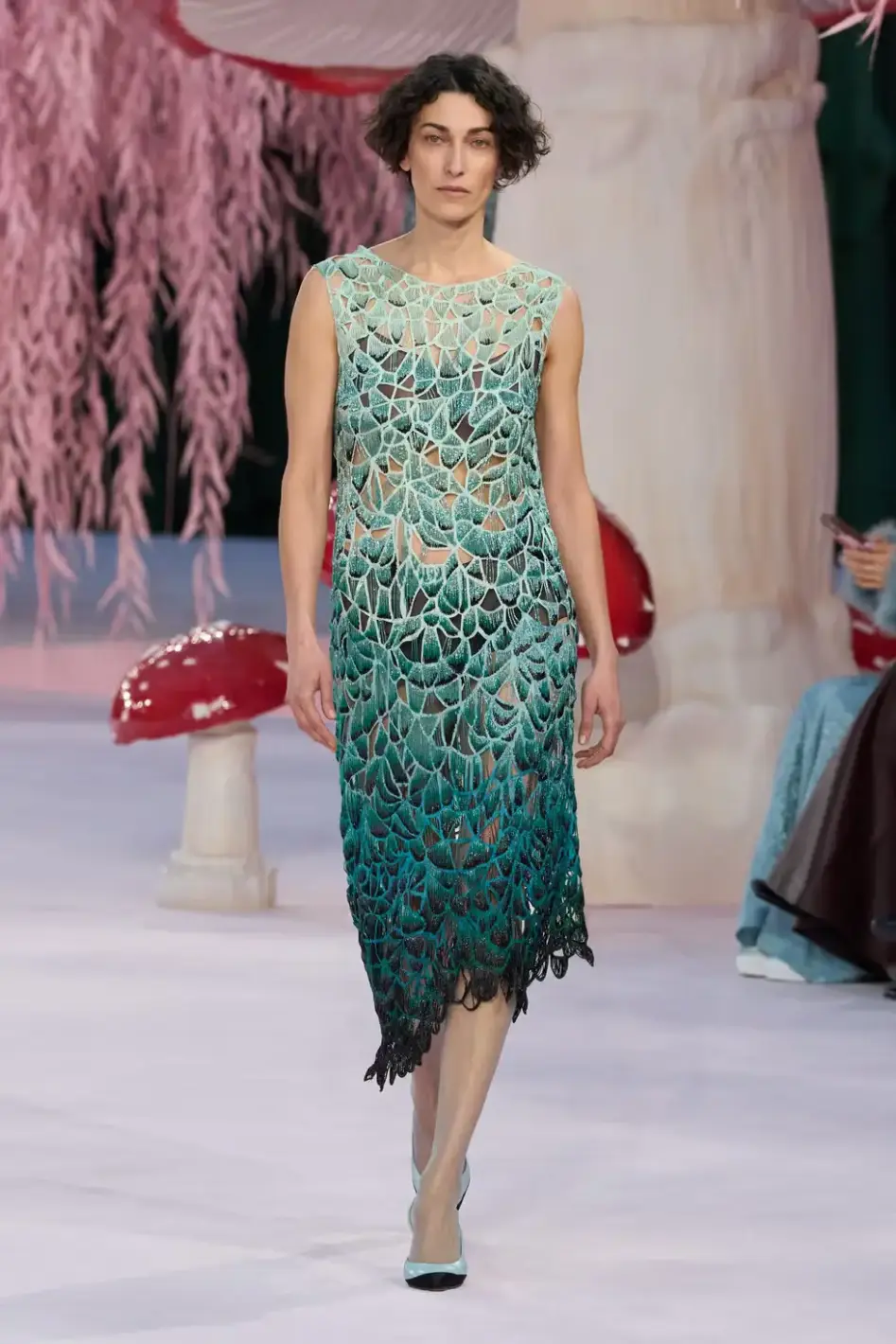 Джонатан Андерсън направи дългоочаквания си дебют във висшата мода в Dior с флорална фантазия от камбановидни силуети, богато украсени поли и изящни детайли. Преработени антични миниатюрни брошки с портрети и дебели плетива предизвикаха традиционните представи за това какво може и какво трябва да бъде кутюр.