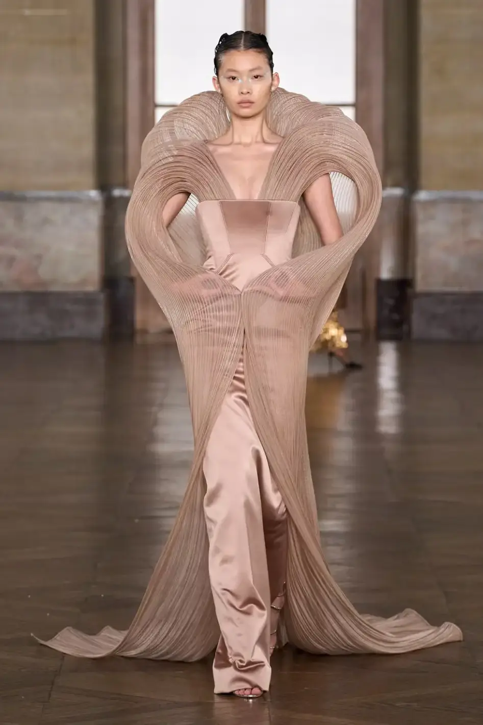 Дизайнерите заложиха на драматизма този сезон, размивайки границата между модата и изкуството със скулптурни, екстравагантни силуети. Рахул Мишра представи сюрреалистични, преувеличени визии, вдъхновени от земята, вятъра, огъня и въздуха, включително рокли с форма на пламъци и летящи, украсени структури. Гаурав Гупта изпрати на подиума два модела, облечени в една сложна дантелена рокля, вдъхновена от чакрите на тялото, заедно с космически рокли и скулптурна бяла сватбена рокля.
