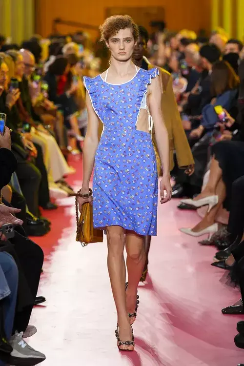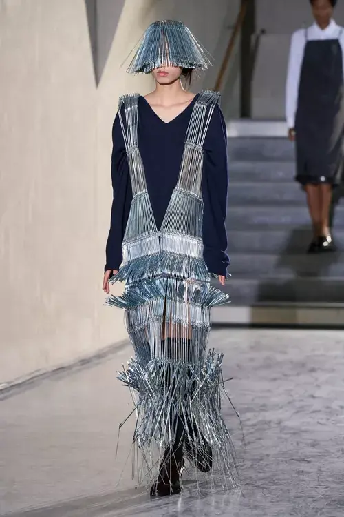 Мотивите от дома навлизат на подиума по неочакван начин. Престилки, жилетки и ретро флорални десени създават образ на ексцентрична домакиня, която изглежда едновременно уютно и леко сюрреалистично – като сцена от стар филм, но с модерен обрат.