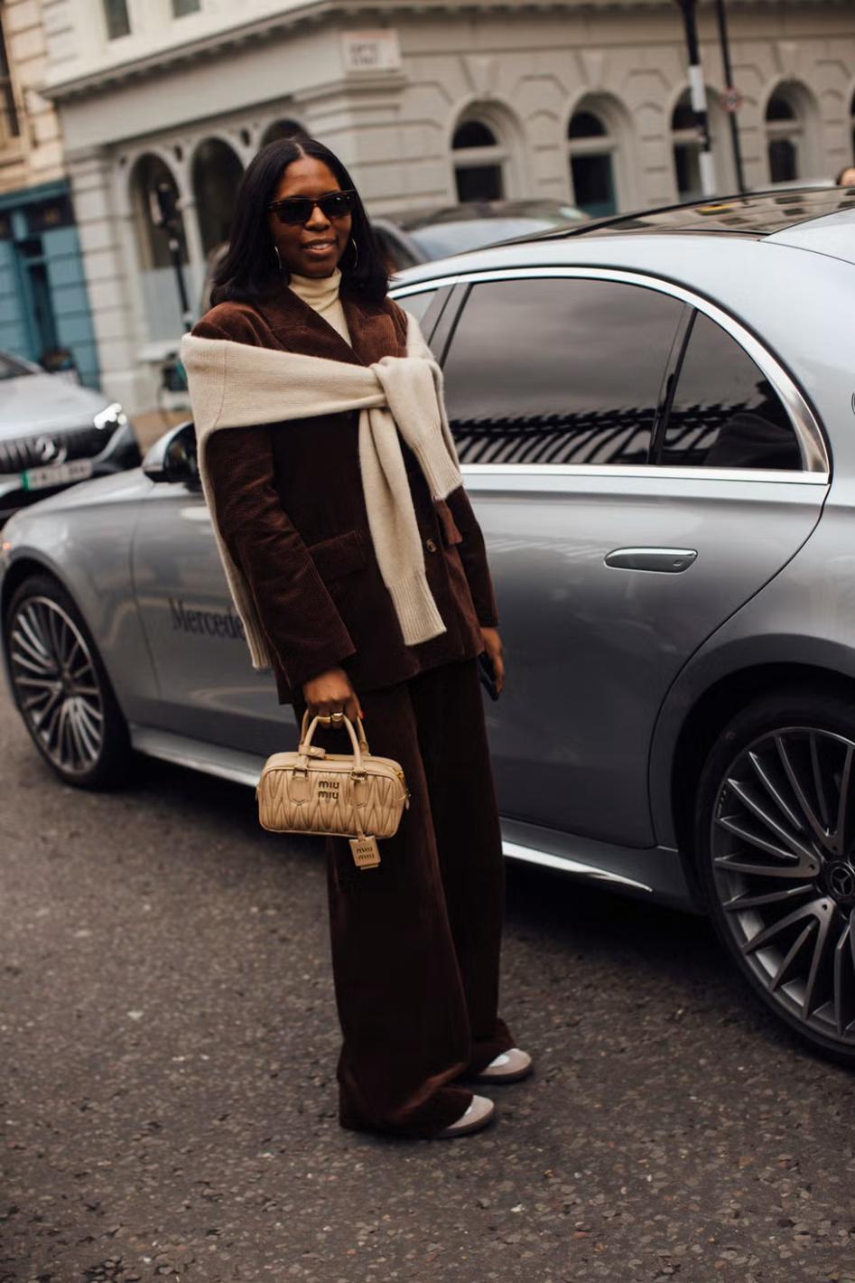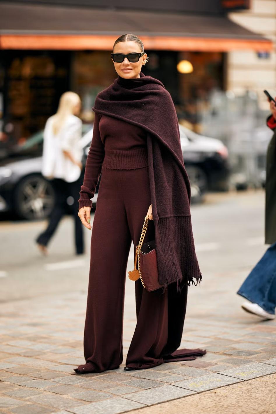 Бордо е определено цветът на сезона – от тъмни винени нюанси до по-ярки червени тонове. Носенето на целия аутфит в една палитра създава изчистена и луксозна визия. Прекрасен завършек е голям шал в същата гама и малка чанта за акцент.