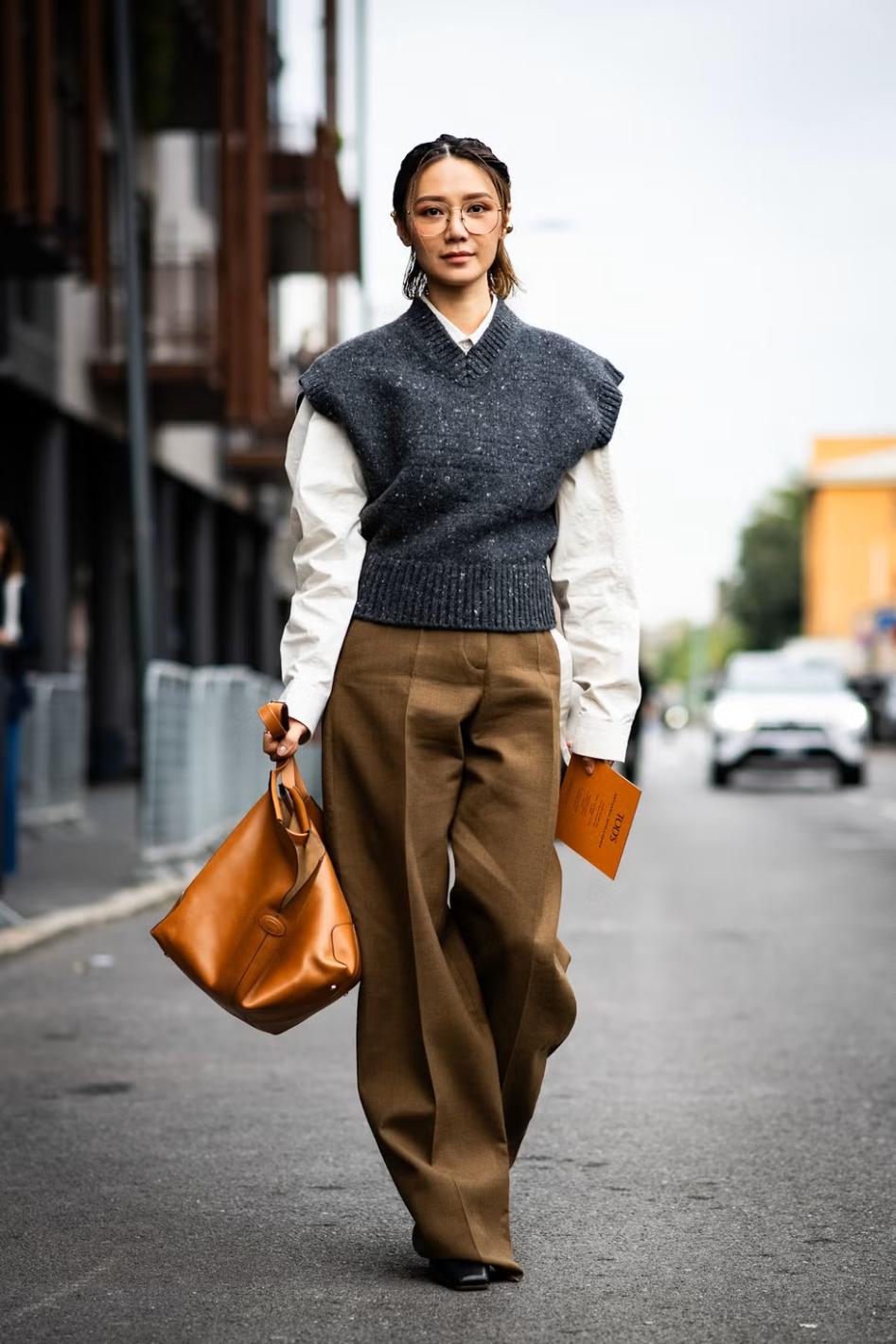 Това е една от най-универсалните зимни формули – вероятно вече имате всичко в гардероба. Бяла риза, широк панталон в карамелено и плетен елек в графитено сиво създават стилен силует. Цветна чанта или шал могат да бъдат идеалният акцент.