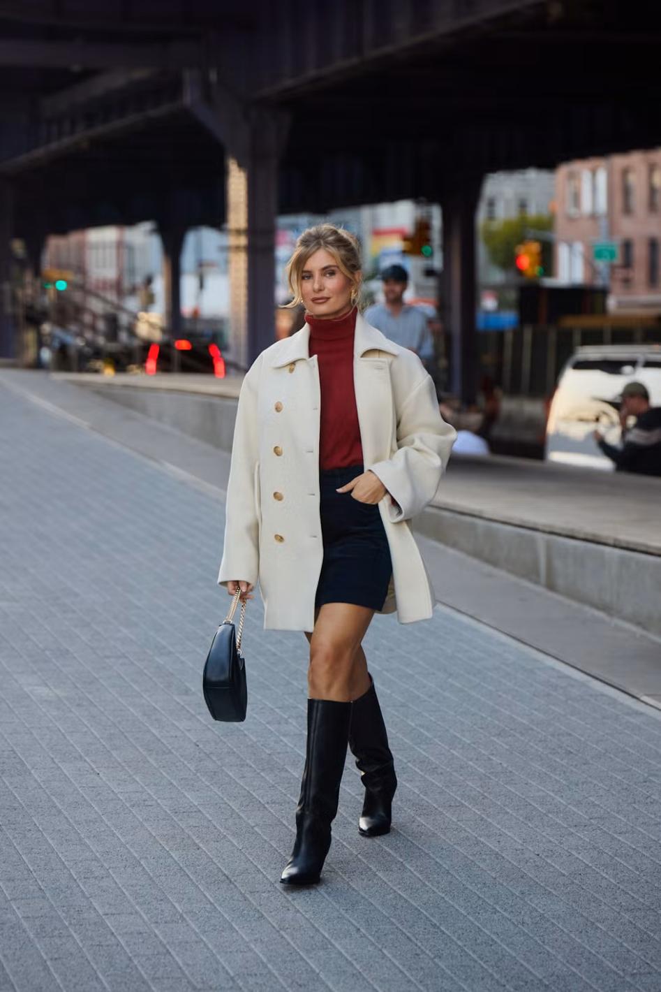 Мини полата не е само за есента. Комбинирана със свободен пуловер в червено, бордо или керемида и палто с дължина около средата на бедрото, тя остава едно от най-женствените зимни предложения. Добавете меки, леко набрани ботуши до коляното и дебел чорапогащник.