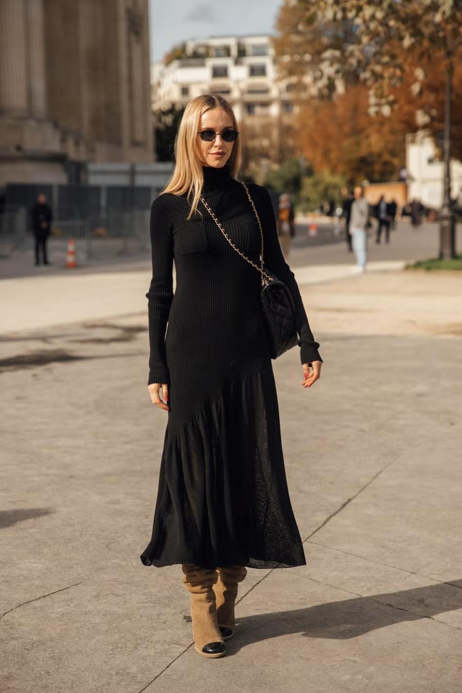Макси рокля от вълна или кашмир е едно от най-стилните и удобни решения за зимата. Черната е най-класическата, но и бежовите и сивите варианти работят отлично. Комбинирайте я с бежови или сиви боти, минимална чанта и слънчеви очила – зимното слънце не е за подценяване.