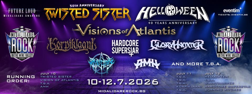 Шестото издание Midalidare Rock In The Wine Valley ще се проведе от 10 до 12 юли 2026 г. Към вече обявените Helloween и Twisted Sister се включват още шест банди, две от които идват за първи път в България.