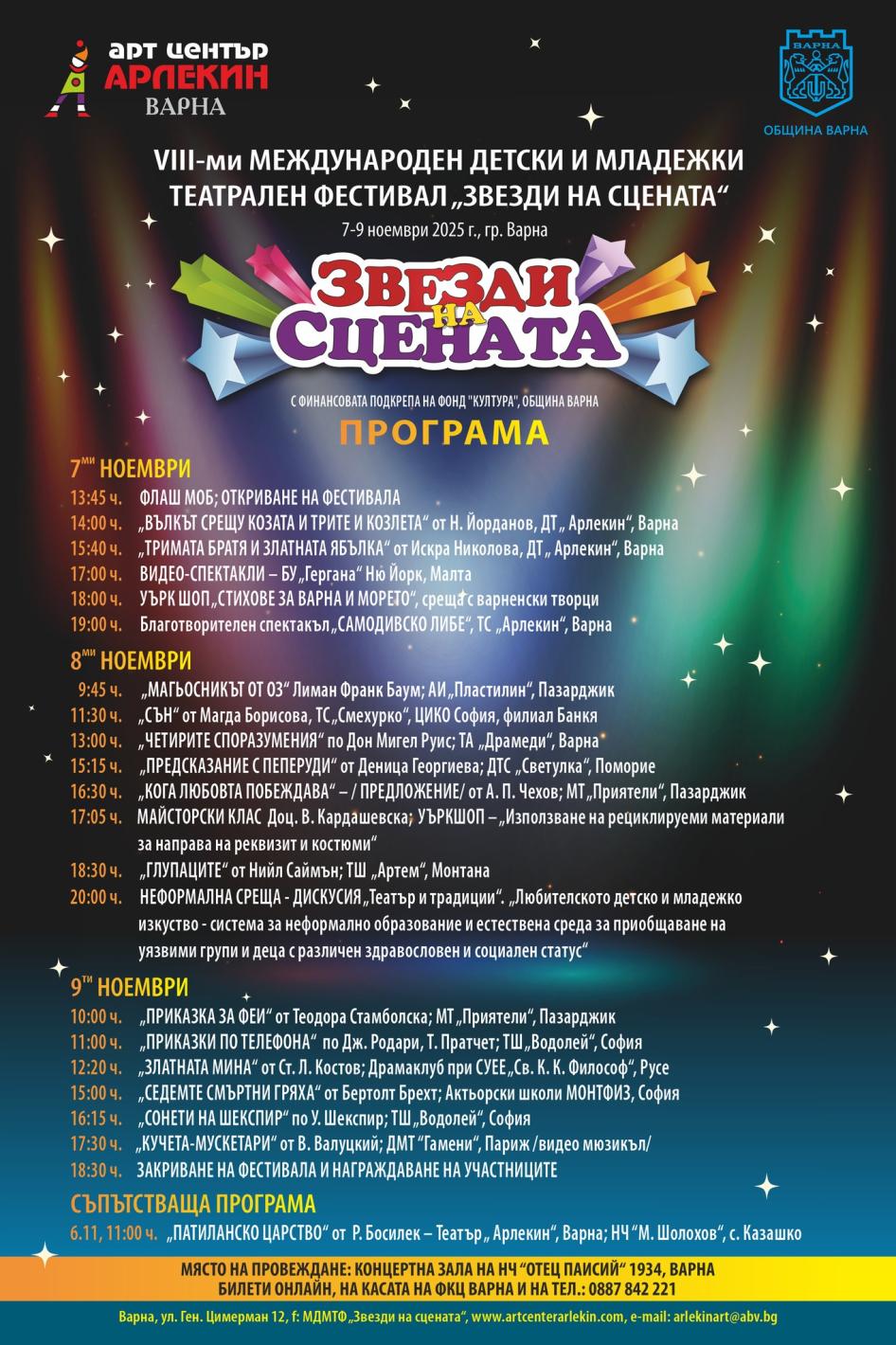 От 7 до 9 ноември Варна е домакин на поредното издание на МДМТФ „Звезди на сцената“, организиран от сдружение „Арлекин арт“ с финансовата подкрепа на фонд „Култура“ при Община Варна.