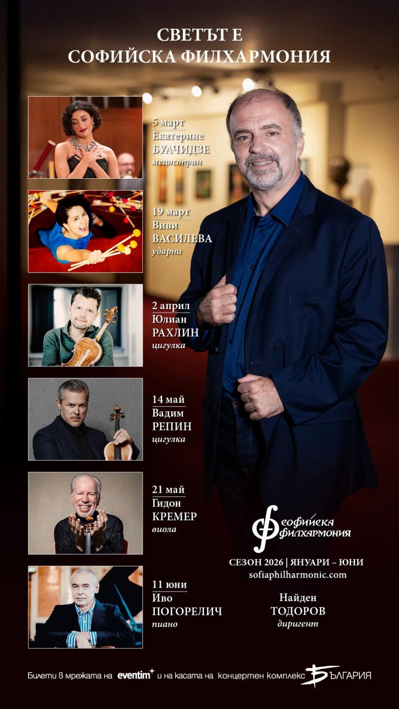 - За втората част от годината нямам право да говоря още, но и през първото полугодие ще бъде доста интересно за публиката ни. Главният диригент на Берлинската филхармония Кирил Петренко ще гостува на националния оркестър през юни – дългоочаквано събитие, което обещава да се превърне в празник. В диригентската плеяда блестят още световнопризнатите Кристоф Ешенбах, Нееме Ярви, Мишел Табачник и българските им колеги Емил Табаков, Георги Димитров, Росен Миланов, Вилиана Вълчева, Григор Паликаров, Владимир Кираджиев. И този сезон събира изключителен списък от солисти. Победителката на конкурса „Опералия” Екатерине Буачидзе се завръща за рецитал през март. В същия месец със Софийската филхармония ще свирят перкусионистката Виви Василева и пианистът Михаил Плетньов. Юлиан Рахлин пристига в София в началото на април, а седмица след това ще посрещнем