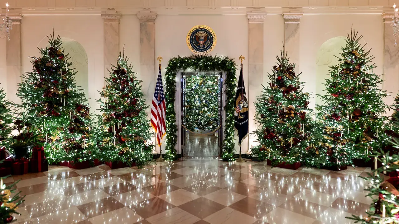 Източната зала е декорирана в патриотичните цветове червено, бяло и синьо, с национални символи, включително орли, поставени като върхове на дърветата – препратка към предстоящото национално честване America250. Белоглавият орел е избран за символ на новосъздадената държава през 1782 г. Дърветата са украсени и със звезди, рози и дъбови листа.