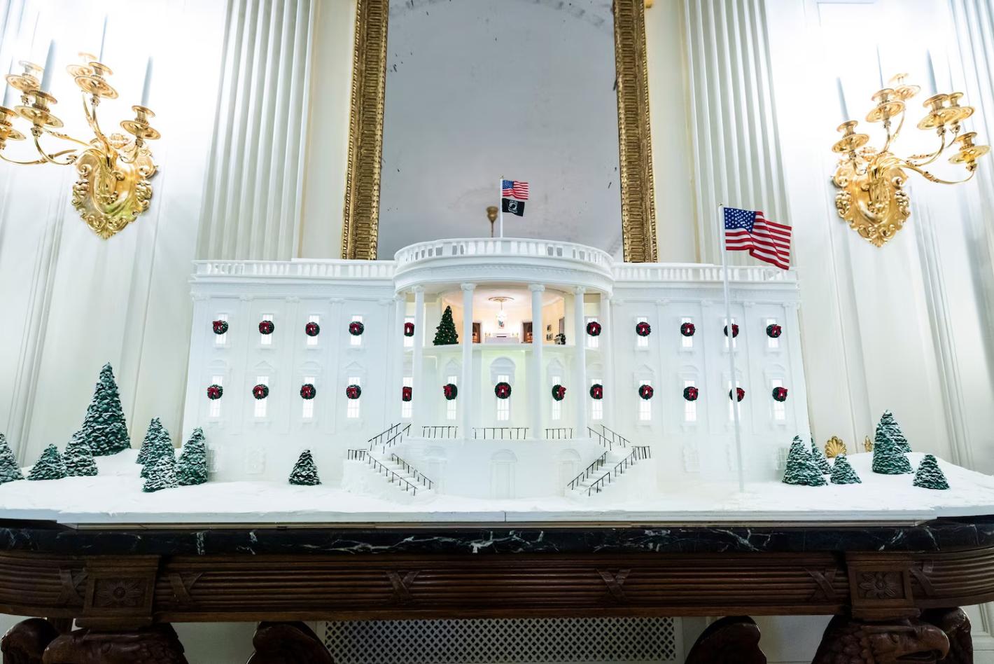 Традиционният джинджифилов макет, изложен в Държавната трапезария, тази година пресъздава южния портик и изгледа към Жълтата овална стая на втория етаж – така, както изглеждат с актуалната коледна декорация.