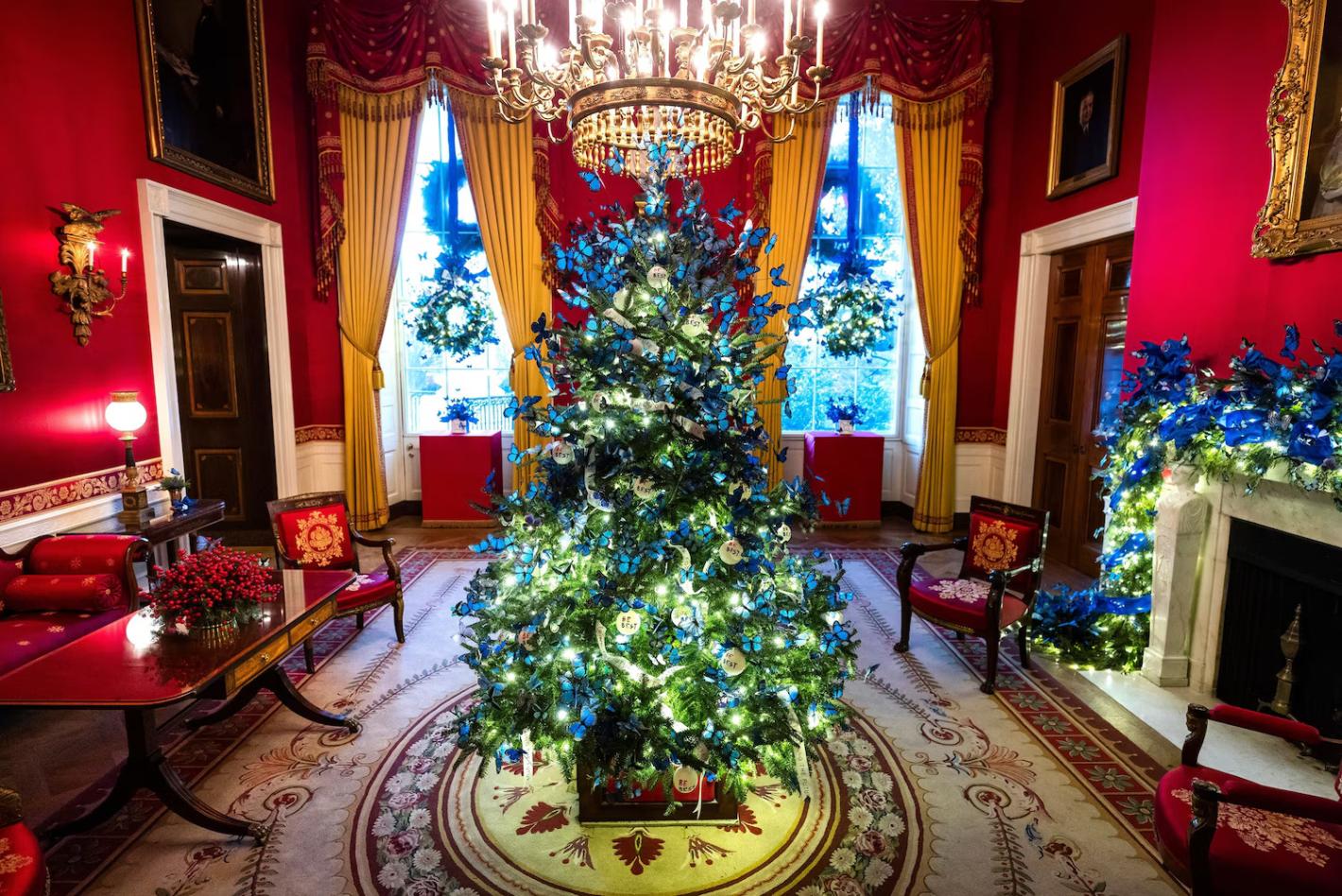 Червената зала е украсена с хиляди декоративни пеперуди – символ на инициативата на Мелания Тръмп „Fostering the Future“, част от програмата ѝ „Be Best“ в подкрепа на младежи, израснали в приемни семейства.