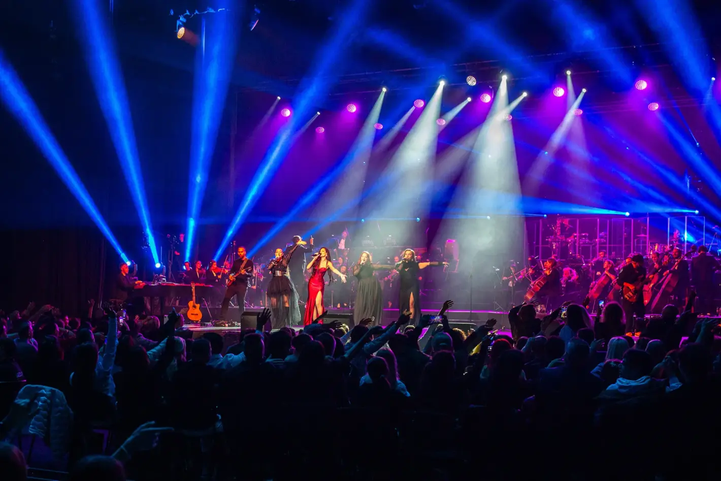 Когато червените кадифени завеси се отвориха зад тях се появи цял симфоничен оркестър – Симфониета Враца, банда, беквокали и накрая ослепителната Михаела Филева.