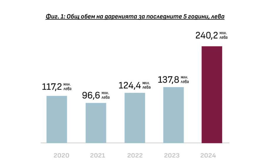 240,2 млн. лв. са даренията за различни каузи в България през 2024 г, което представлява ръст от 74% спрямо предходната година, показва годишният анализ на Българския дарителски форум (БДФ). Той е изготвен на база на данни от НАП, НСИ, финансови отчети на фондации и дарителски платформи, мобилни оператори и националнопредставително социологическо проучване.