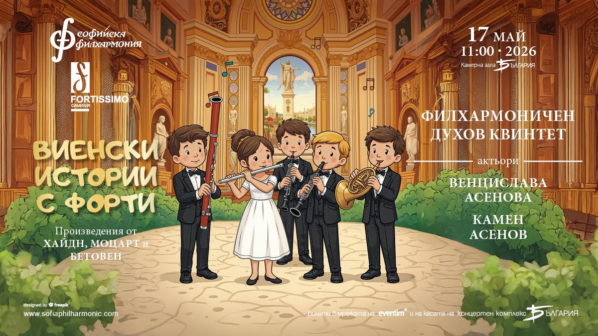 На 17 май Духовият квинтет на Софийската филхармония ще разкаже „Виенски истории с Форти“, за да въведе децата в света на Хайдн, Моцарт и Бетовен с помощта на актьорите Венцислава и Камен Асенови.