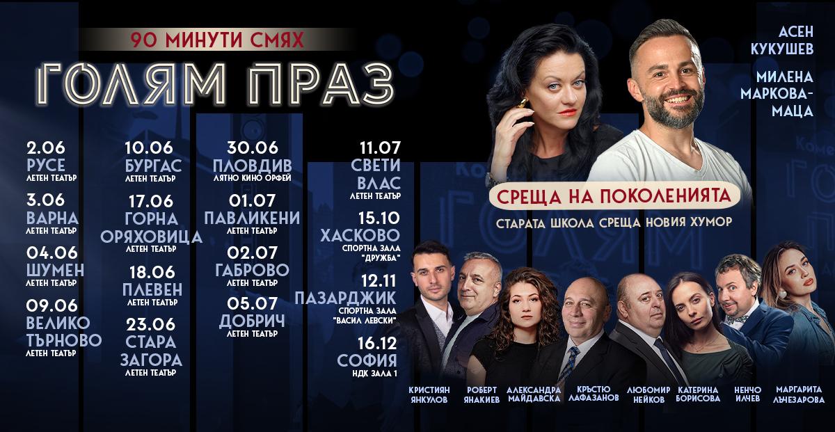 След три разпродадени вечери в София, Варна и Пловдив, комедийното скеч шоу, което доказа, че българинът все още знае как да се смее от сърце, тръгва на най-мащабното си турне до момента. От 2 юни до 16 декември „Голям праз“ ще премине през 16 града, за да напомни, че истинският хумор не се случва пред екрана, а тук и сега. Форматът е прост и безотказен: авторски скечове, създадени специално за сцената, музикални изпълнения, интригуващи фокуси и онзи директен контакт с публиката, при който никой не знае точно какво предстои.
