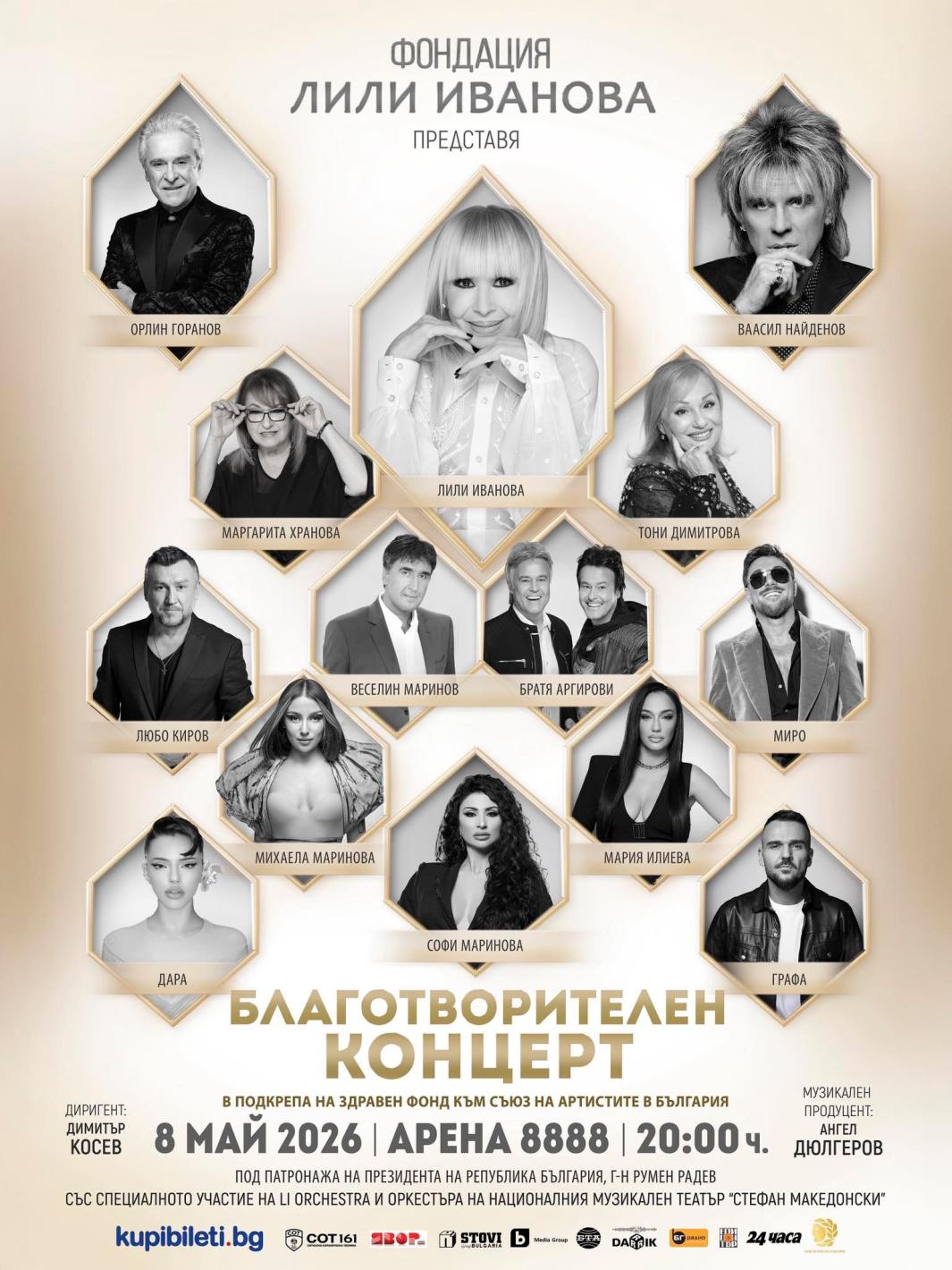Лили Иванова кани едни от най-големите имена на българската попмузика за съвместен благотворителен концерт. Бляскавото шоу, на което домакин ще е самата Лили Иванова, ще събере на 8 май 2026 година на голямата сцена на зала „АРЕНА 8888“ в София любимите на публиката изпълнители: Васил Найденов, Маргарита Хранова, Орлин Горанов, Тони Димитрова, Любо Киров, Графа, Миро, Веселин Маринов, братя Аргирови, Мария Илиева, Софи Маринова, Дара и Михаела Маринова. Концертът ще бъде букет от най-вълнуващите им хитове, представени на живо с бенд и симфоничен оркестър в чисто нови аранжименти.