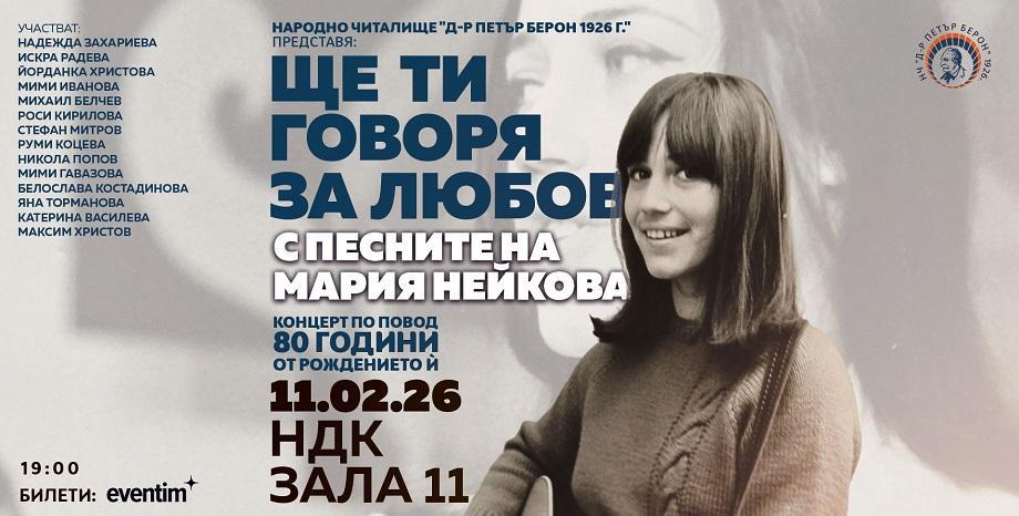 „Ще ти говоря за любов“ с песните на Мария Нейкова е концерт, посветен на 80-годишнината от рождението на певицата и композиторката. В програмата ще прозвучат музикални произведения, станали любими за много поколения и влезли в златния фонд на българската поп музика, съобщават организаторите от НЧ „Д-р Петър Берон 1926“.