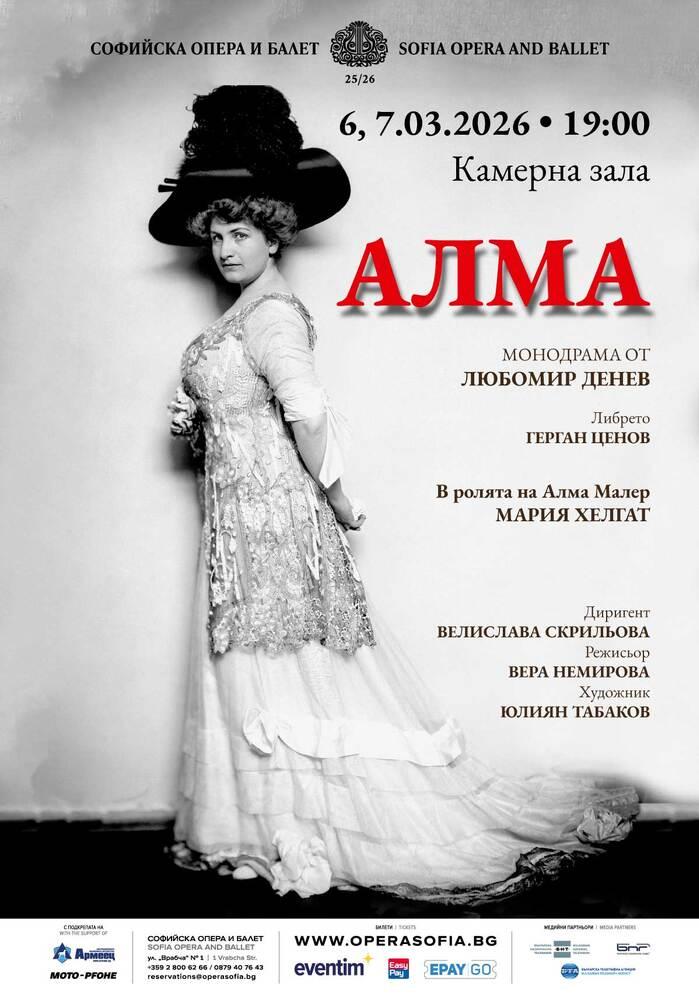 Софийската опера представя за първи път – на 6 и 7 март, „Алма“, музикална монодрама от Любомир Денев, съобщиха от БТА.