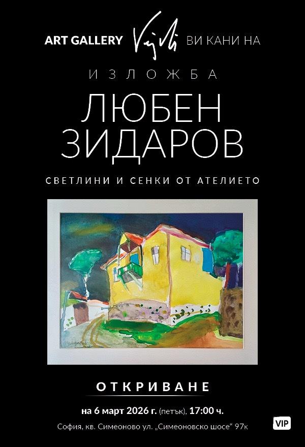 Подбрани творби на именития художник Любен Зидаров ще бъдат показани в столичната арт галерия Vejdi. В експозицията, озаглавена „Светлини и сенки от ателието“, ще бъдат подредени повече от 20 акварели, рисунки, илюстрации, платна с маслени бои, както и печатна графика. Откриването е на 6 март от 17:00 часа и изложбата може да бъде разгледана до 24 март, информират домакините.