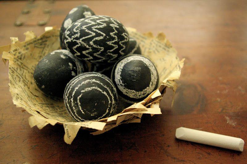 Това определено е една от най-креативните и забавни тенденции тази година в боядисването на яйцата. А най-хубавото е, че самият дизайн не е окончателен, може да рисувате, триете и да започвате отначало толкова пъти, колкото искате. Това, което ви трябва за направата на тези яйца е акрилна или спрей боя с черен матов ефект, цветни, или бели тебешири и лак, ако искате нарисуваното от вас да се запази по-дълго. Накрая остава само да напишете желаното от вас послание върху яйцето или просто да надраскате нещо забавно върху него.