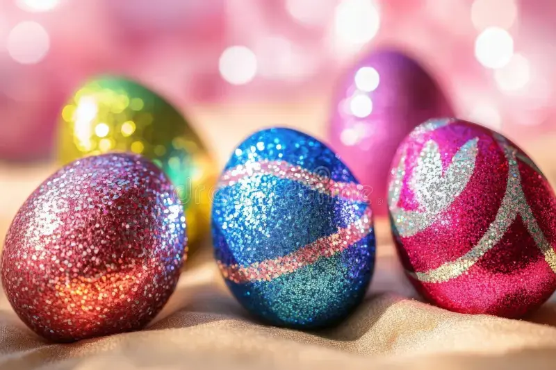 Блестящите великденски яйца са перфектният избор, ако искате да направите нещо малко по-интересно и впечатляващо. Идеята тук е да се добави блясък, чрез брокат, златни частици или лек металически ефект. За направата им ще са ви необходими лепило, специални брокатени декоративни елементи или бои. Може да експериментирате с различните цветове, като първо боядисате яйцето с матова основа, а след това да добавите златен акцент, за да изглеждат стилни, а не прекалено кичозни.