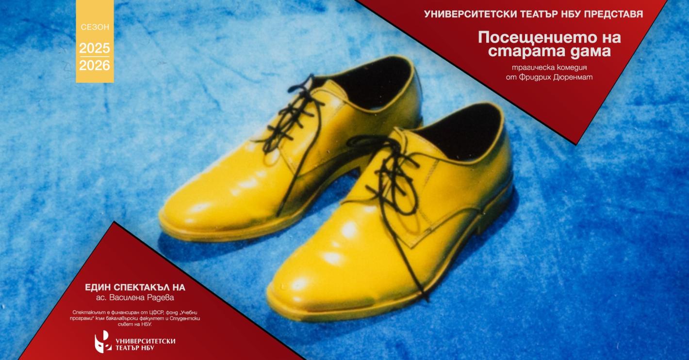 Студенти от Нов български университет представят премиера на трагическата комедия „Посещението на старата дама“ от швейцарския драматург Фридрих Дюренмат.
