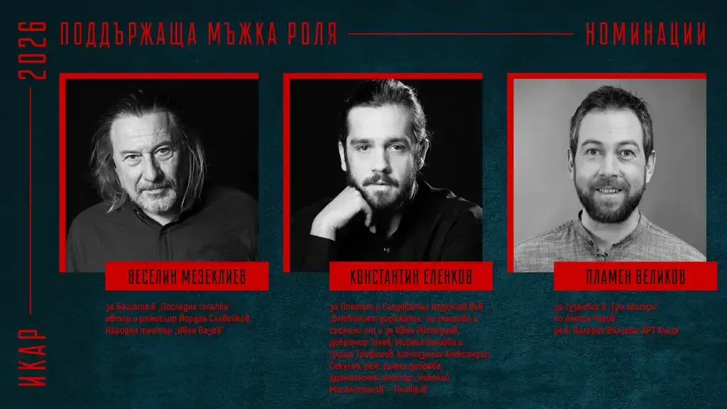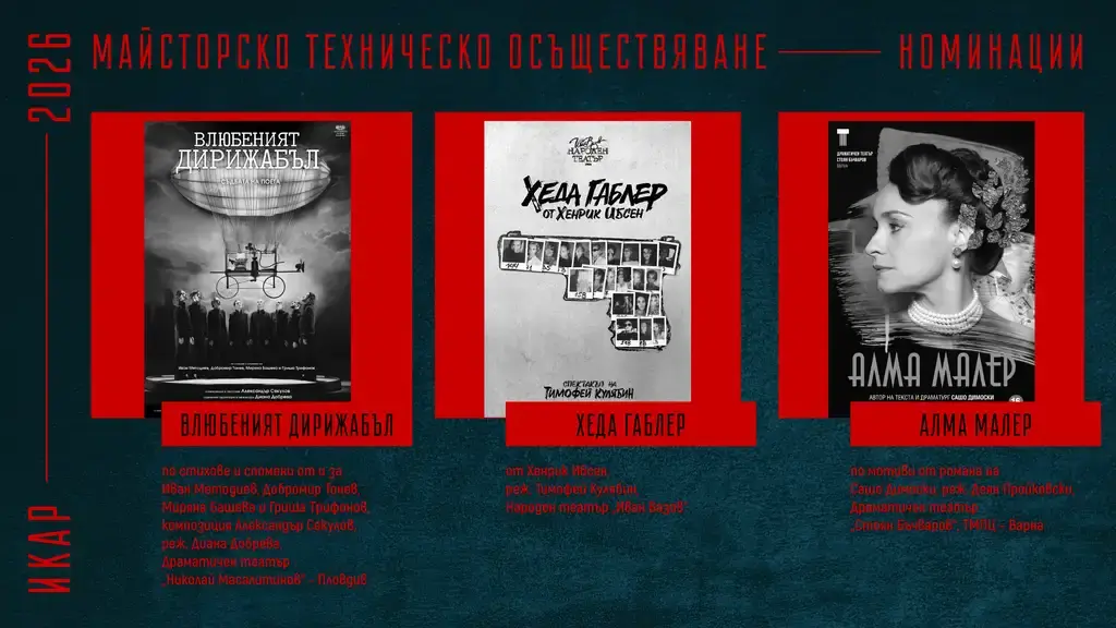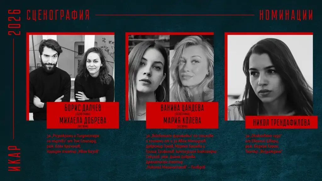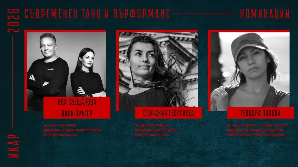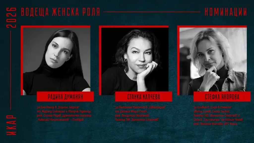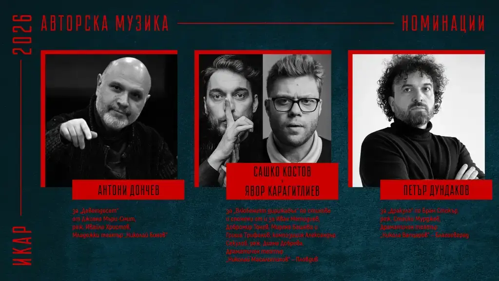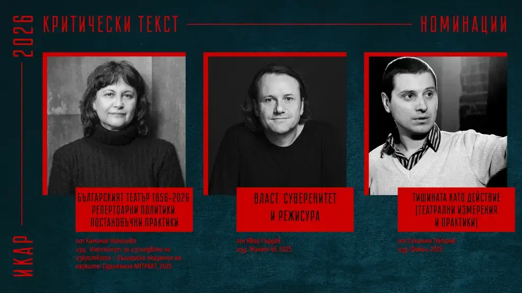 Съюза на артистите в България обяви номинациите си за наградите „Икар“ 2026 г. на специална пресконференция. В нея участваха председателят на Съюза Христо Мутафчиев, актьорът Севар Иванов, както и заместник-ректора на НАТФИЗ проф. д-р Пенко Господинов, заместник министърът на културата Георги Султанов и директорът на дирекция „Култура“ към Столична община – Биляна Генова.