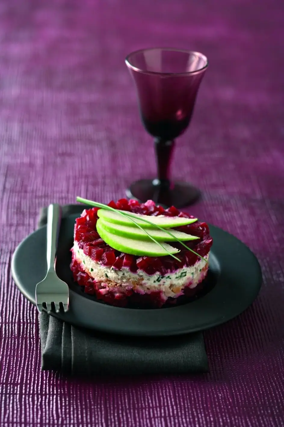 Обелете цвеклото, нарежете го на малки кубчета и го сложете в купа заедно с маслото и оцета. Посолете, поръсете с черен пипер и разбъркайте. Измийте ябълката и я нарежете на тънки резенчета, като отстраните сърцевината и семките. Полейте ги с лимонов сок, за да не почернеят, и оставете настрана. Нарежете чесъна на ситно, счукайте ореховите ядки и ги смесете с козето сирене. Отделно филетирайте пъстървата с нож и я оформете на ленти. В четири чаши подредете слой от кубчета цвекло, покрийте с рибата, след това добавете сместа с козето сирене, завършете с още кубчета цвекло и украсете с резените зелена ябълка. Оставете ги на хладно до момента на сервиране. Ако желаете, можете да поднесете предястието и в чиния, както е показано на снимката, и да украсите съда допълнително за още по-красива визия.
