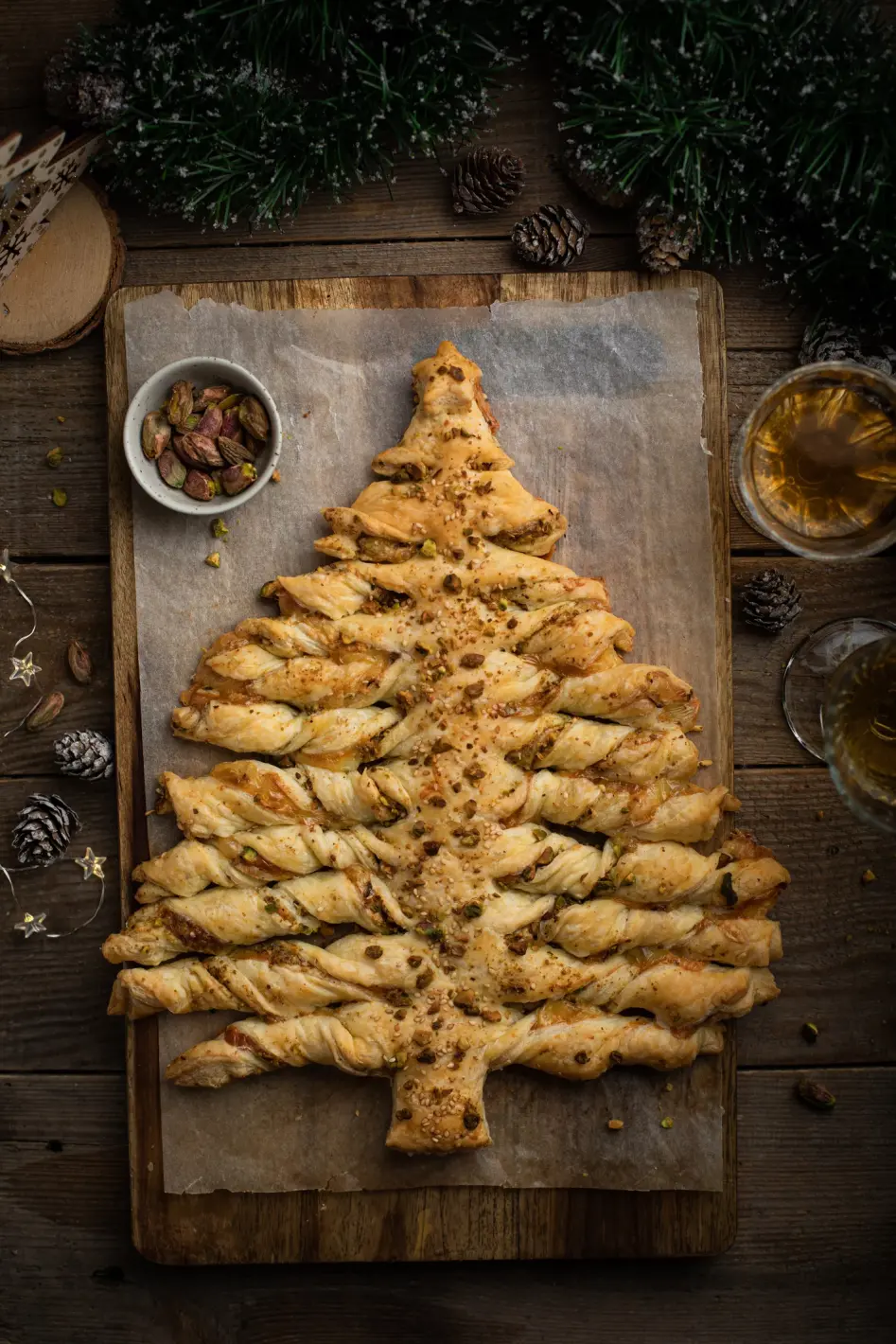 Разточете едното бутер тесто и го поставете върху тава, покрита с хартия за печене. Намажете го обилно с песто, добавете няколко шамфъстъка, предварително счукани на ситно, и покрийте с втория слой тесто. С помощта на нож изрежете тестото във форма на елха, като започнете от ствола. Оформете триъгълник и след това направете тънки ленти от всяка страна за клоните. Усучете клончетата, както е показано на снимката по-горе, намажете с жълтък и печете 20–25 минути на 200 °C. Поднесете топлото печиво с купичка кисело мляко или бърз чеснов сос с малко майонеза.