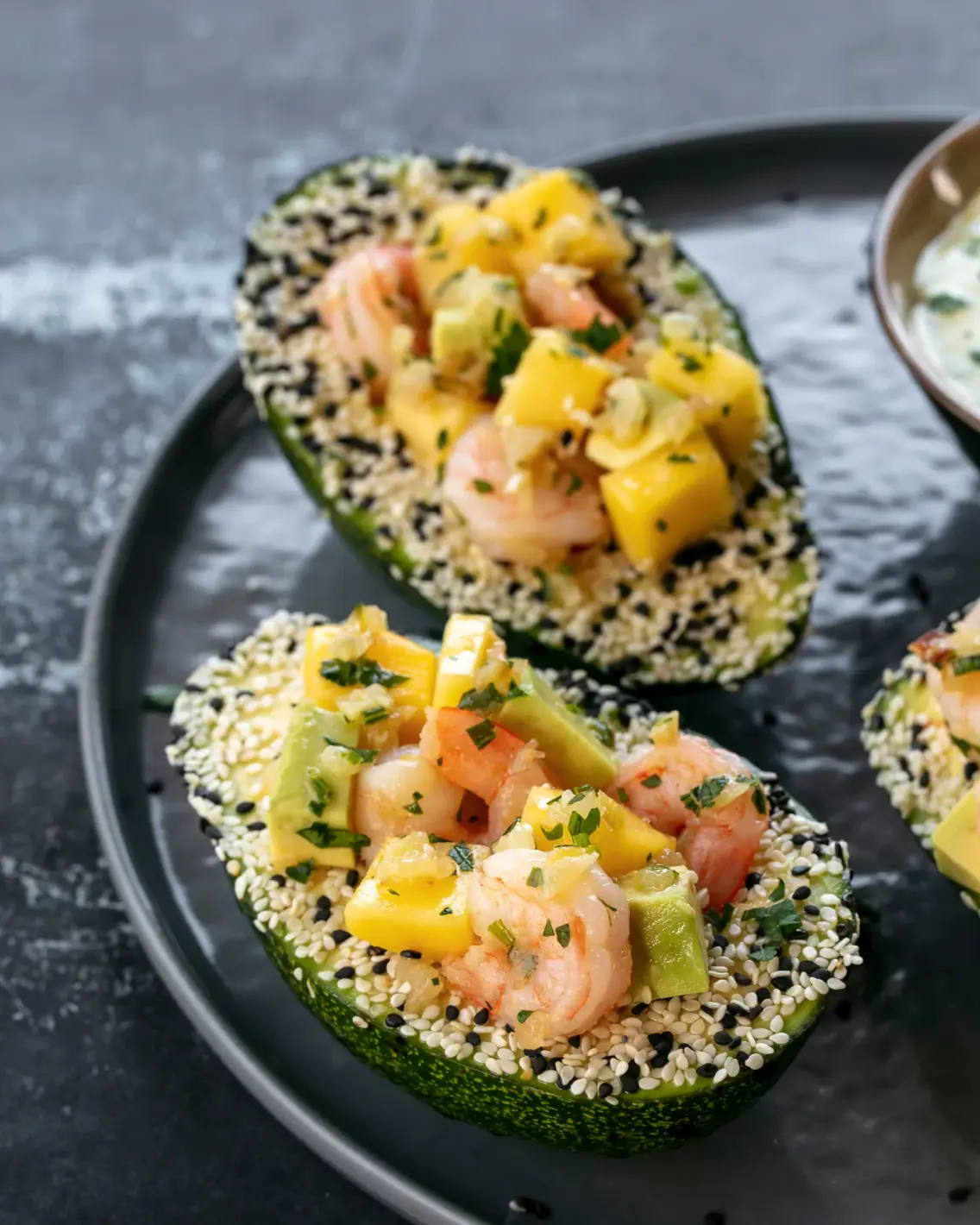 Авокадо, пълнено с скариди, манго и сусам