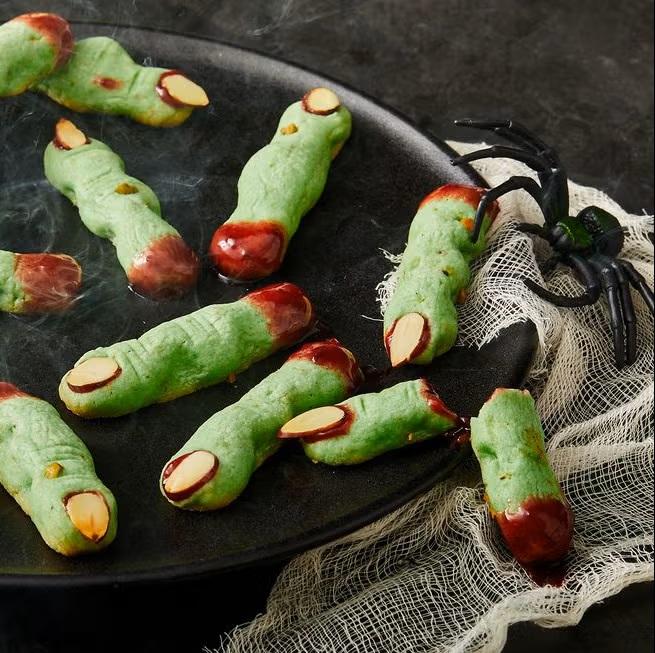 Тези сладки изглеждат зловещо реалистично – а са просто хрупкави маслени бисквитки с бадемови „нокти“. Замесете класическо тесто за бисквити (брашно, масло, захар и ванилия), оформете като пръсти, поставете бадем на върха и направете леки разрези за ставите. Изпечете ги до златисто, а след това можете да добавите „кръв“ от ягодово или малиново сладко. Ако искате да са още по-страховити добави капка боя в сместа и ги поръсете с канела.