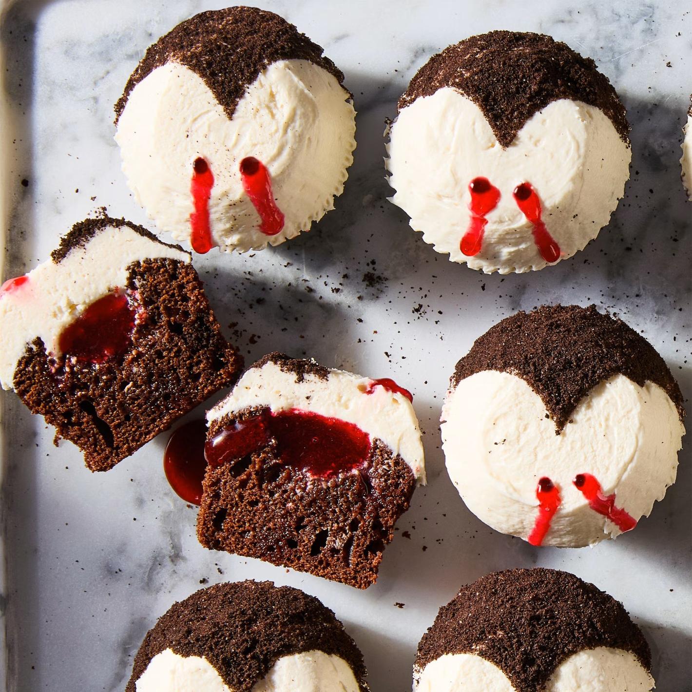 Меки, пухкави и наситени с шоколадов вкус, те крият кърваво сладка изненада в центъра си – пълнеж от ягодово сладко, който изглежда като истинска „вампирска кръв“. Отгоре са покрити с лек маршмелоу крем, напомнящ на облак, а финалният щрих е украсата във формата на емблематичната прическа на Дракула – с черна глазура.