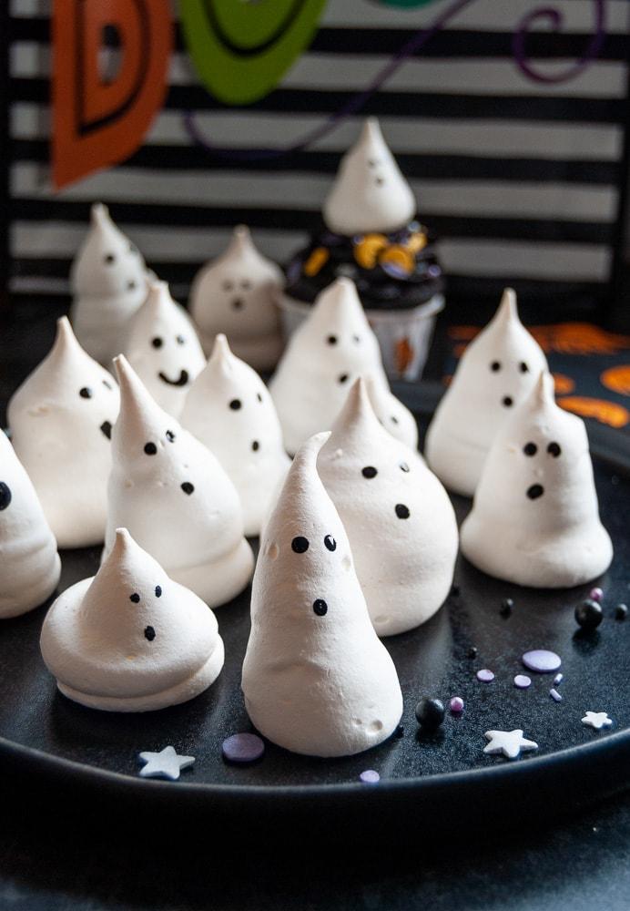 Снежнобели, леки и хрупкави – класическите целувки се превръщат в малки призраци, ако им придадете форма с шприц и нарисувате очички с разтопен шоколад. Изглеждат сладко, но и малко плашещо – идеални за Хелоуин!