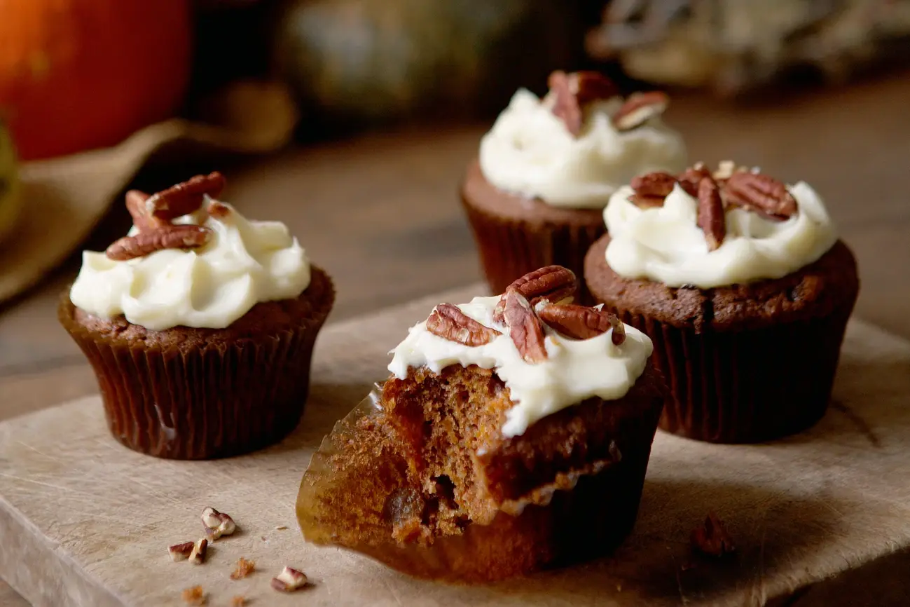 За да направите глазурата, разбийте крема сиренето и захарта, докато станат гладки, след което разнесете върху кексчетата. Оставете ги така или украсете с печени орехи.