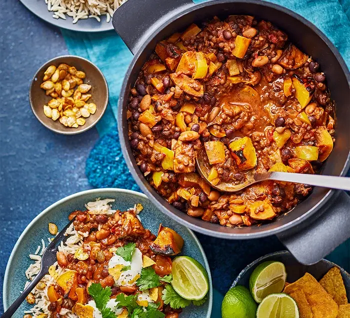 Добавете печената тиква, боба и шоколада към чилито. Оставете да къкри за 5 минути, докато бобът се затопли, след което опитайте за подправки. Можете да го сервирате с гарнитура ориз или печени картофи, поръсени с тиквени семки и подправки по ваш избор.